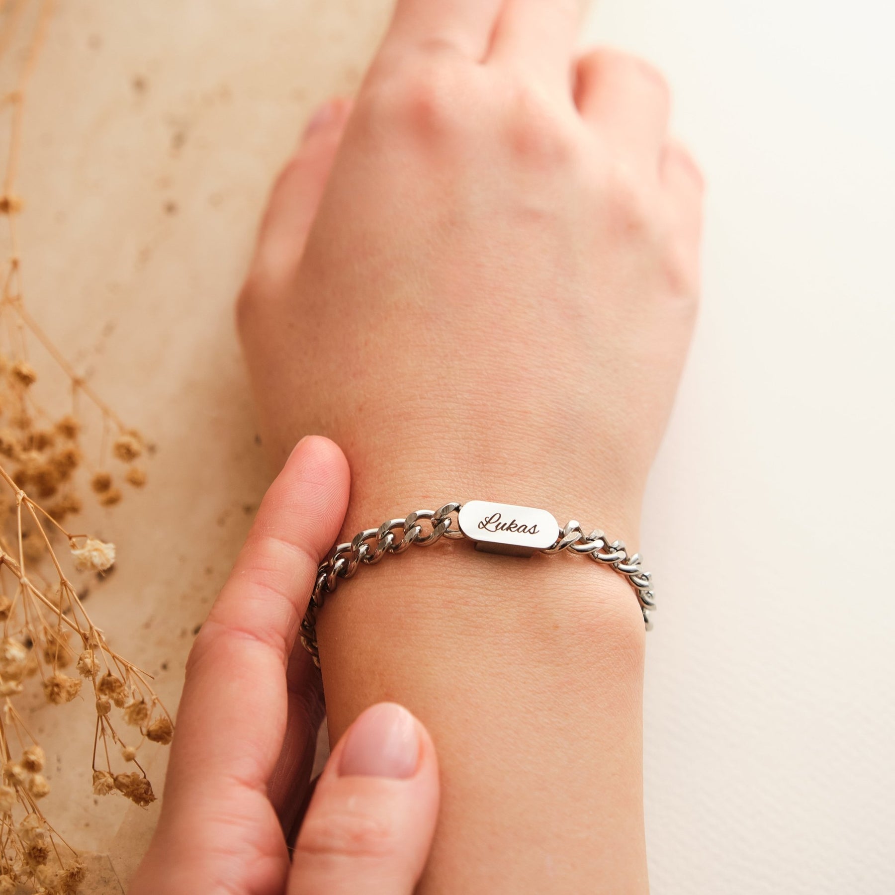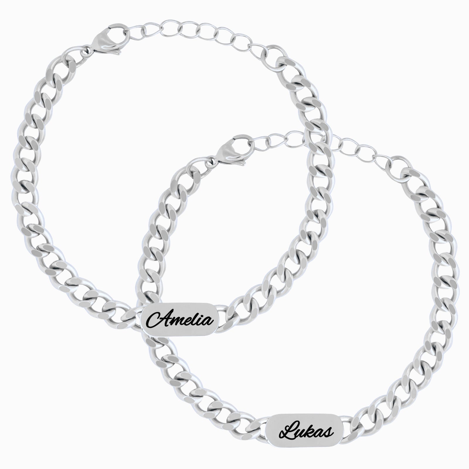 Cuando una joya no es solo un accesorio, sino una pieza única, esta pulsera es la elección correcta. Con nuestra pulsera personalizada para parejas, tu estilo personal se hace visible. La pulsera se puede personalizar con un nombre, palabra o fecha, y sería tu joya de moda única. Para todos los individualistas, pero también como un regalo creativo, la pieza de joyería perfecta que destaca con cualquier atuendo, ya sea deportivo o elegante.