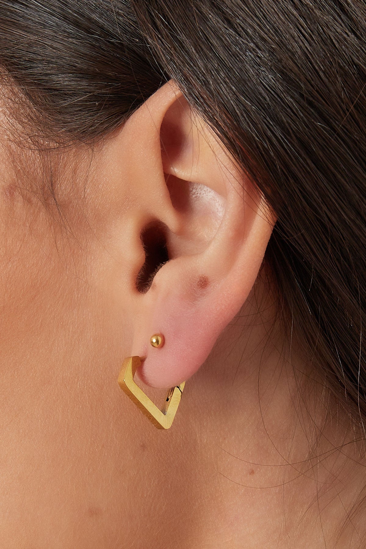 Con estos pendientes de tamaño mediano en forma de diamante, harás una declaración de estilo. La forma geométrica combinada con el acabado dorado brillante convierte estos pendientes en la pieza ideal de joyería para una elegancia moderna. Son lo suficientemente versátiles como para embellecer tu atuendo tanto en el día a día como en ocasiones especiales.