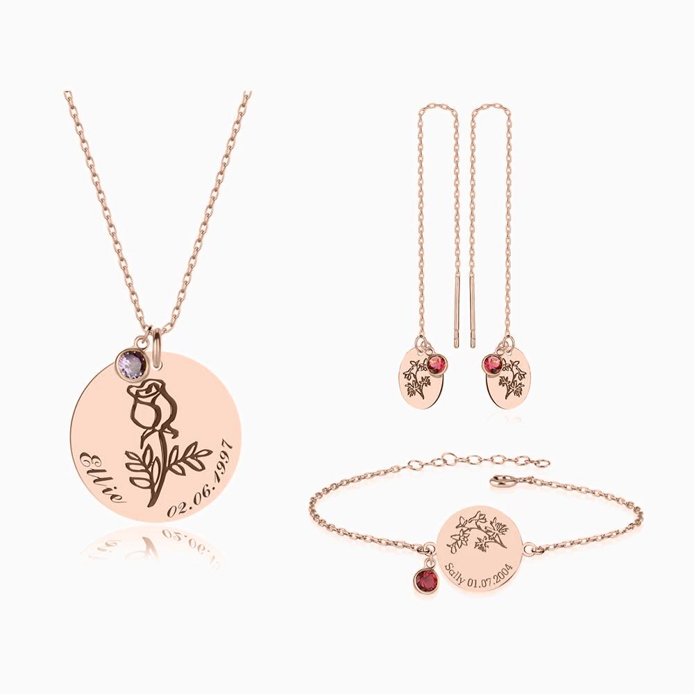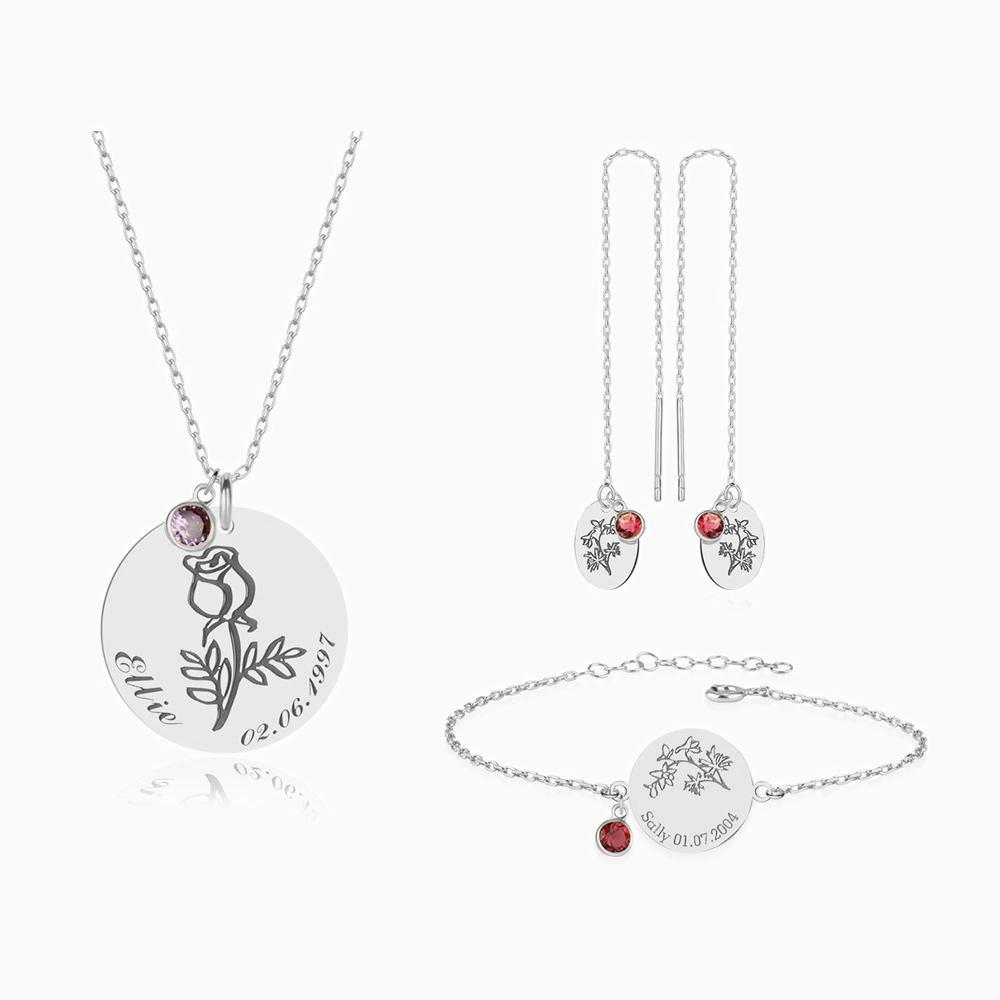 Nuestro exclusivo set de flores de nacimiento es la combinación perfecta entre elegancia y significado personal. El set incluye un delicado collar, una pulsera filigranada y pendientes a juego, todos fabricados en plata 925 de alta calidad y adornados con el grabado de tu flor de nacimiento.