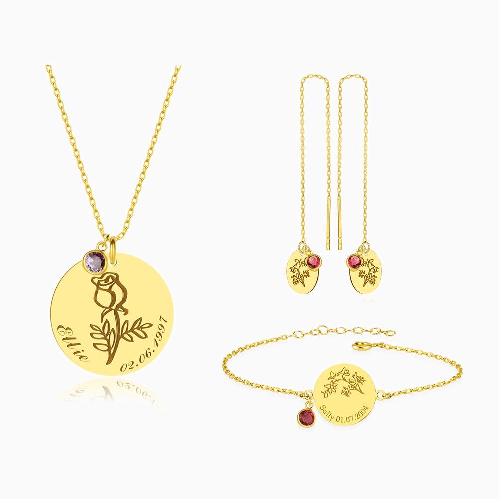 Cada joya se complementa con piedras del mes brillantes que corresponden a tu mes de nacimiento, añadiendo un toque de color especial al set. Lleva toda la colección o combina las piezas individualmente; este set es adecuado para cualquier ocasión.
