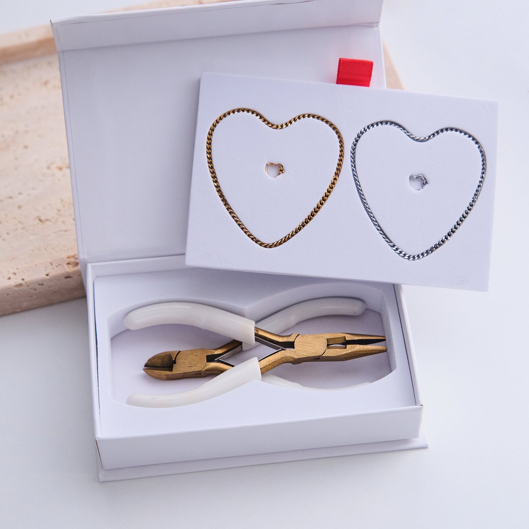 Cada set consta de dos pulseras permanentes, dos cierres especialmente diseñados, un cortador de alambre para ajustar la longitud individualmente y unas pinzas para un cierre seguro.
