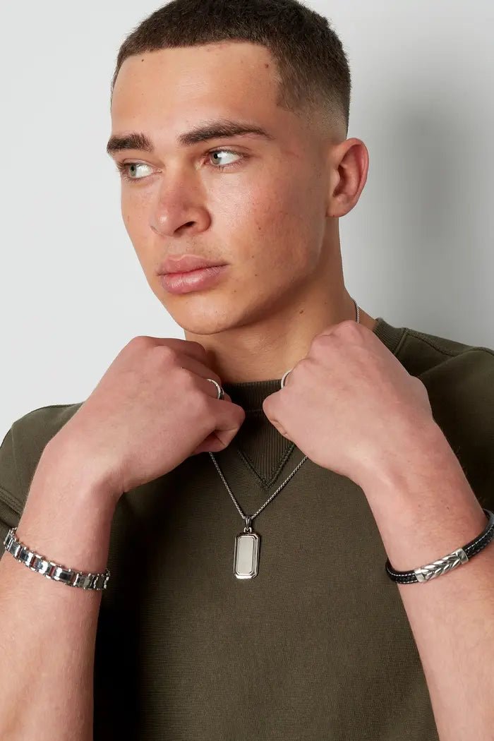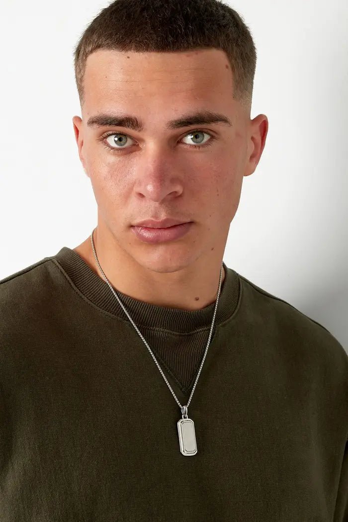 Esta elegante cadena para hombre con colgante plateado está fabricada con acero inoxidable 316L de alta calidad, también conocido como acero quirúrgico. El material es especialmente resistente, no se oxida y es amable con la piel, lo que lo hace ideal para el uso diario. El colgante destaca por su diseño moderno y masculino, que aporta a cualquier atuendo un toque elegante y a la vez vigoroso.