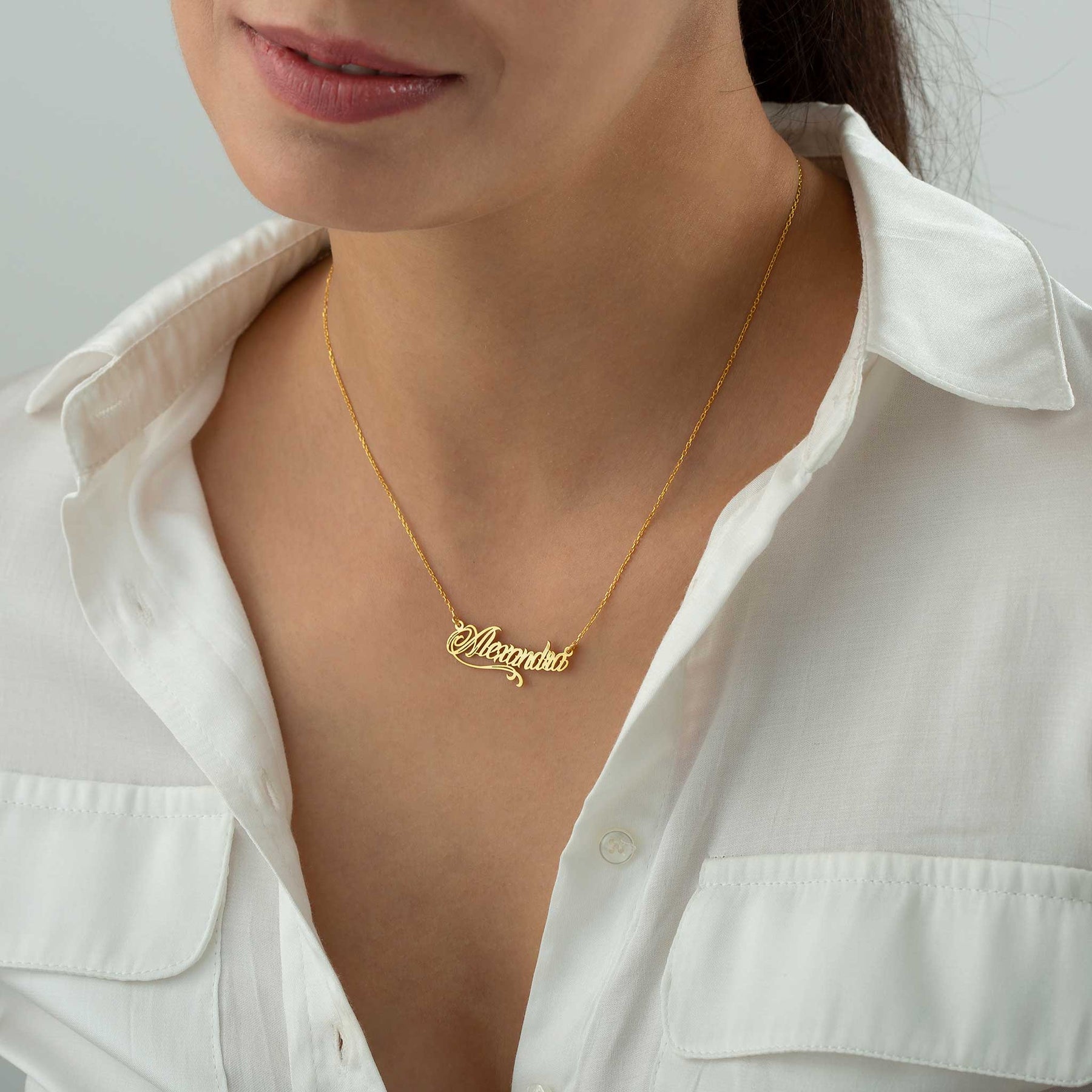 Este collar personalizado con nombre está disponible en varias versiones, incluyendo oro clásico, plata atemporal y moderno oro rosado. También ajusta la longitud de la cadena para asegurarte de que encaje perfectamente con tu estilo personal.
